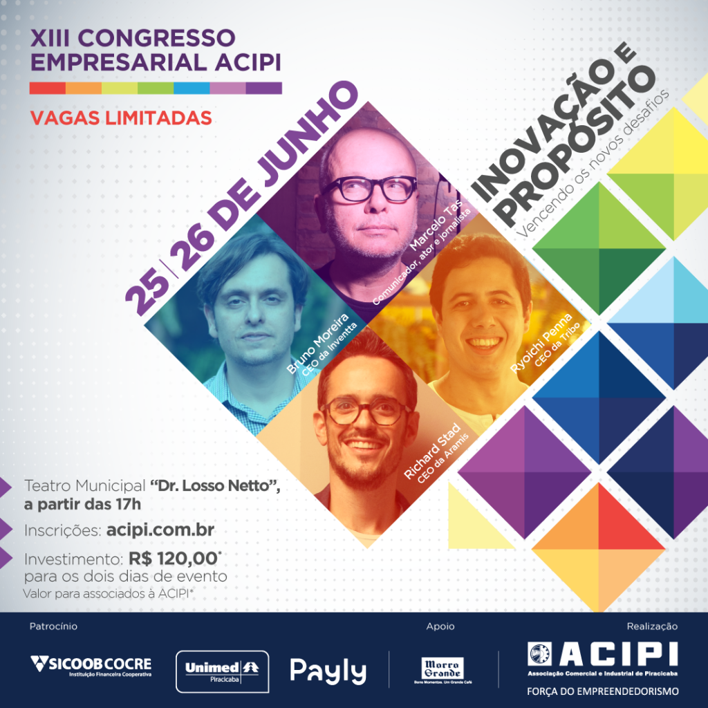 (24-06-2019) A 13ª edição do Congresso Empresarial Acipi (Associação Comercial e Industrial de Piracicaba) ocorre nos dias 25 e 26 de junho, a partir das 17h, e abordará o tema “Inovação e Propósito”. O objetivo do evento é criar espaço para reflexão, capacitação, avaliação de cenários e ampliação de networking.